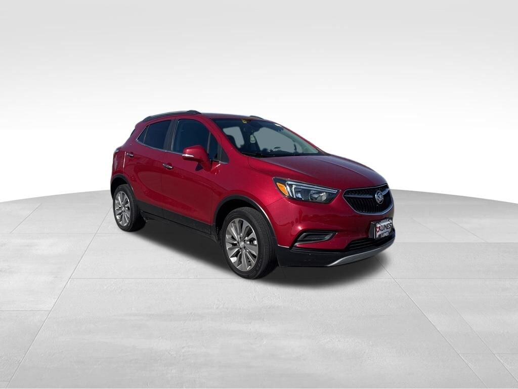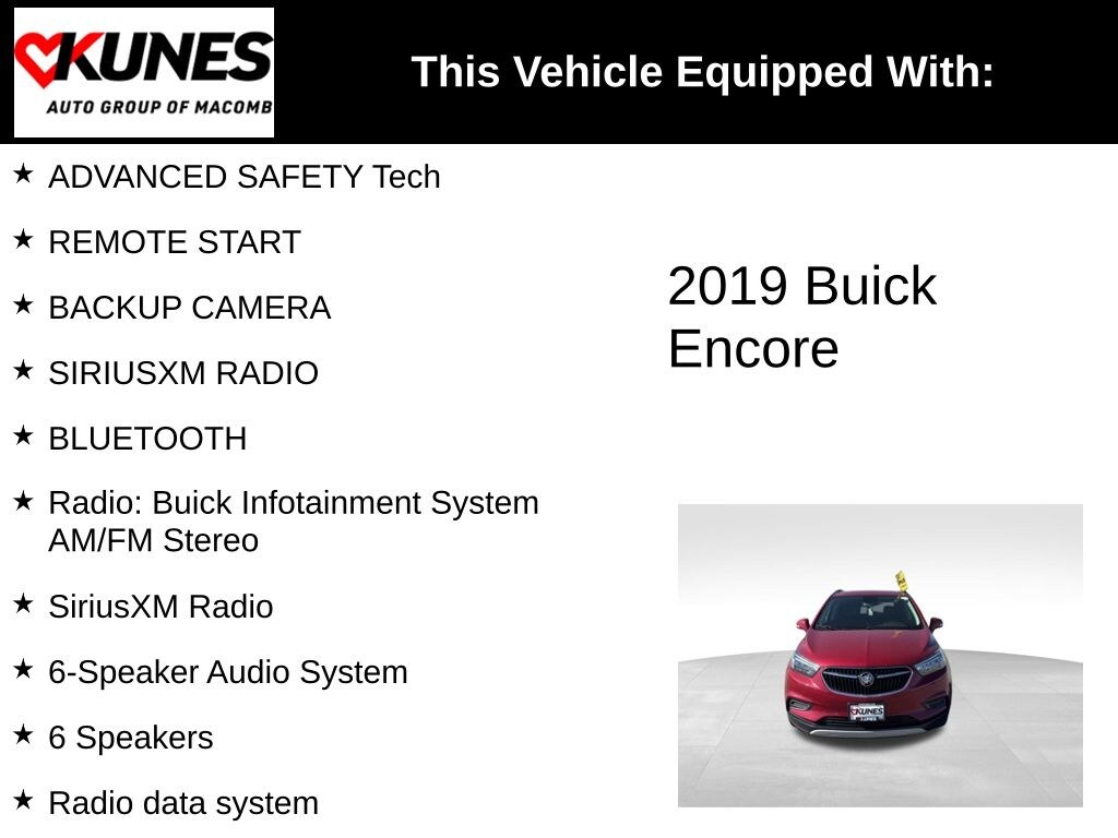 2019 Buick Encore Preferred ADVANCED SAFETY Tech, REMOTE START, BACKUP CAMERA, SIRIUSXM RADIO, BLUETOOTH, 120-Volt Power Outlet, 2-Way Manual Front Passenger Seat Adjuster, 6 Speakers, 6-Speaker Audio System, 6-Way Power Driver Seat Adjuster, Brake assist, Bumpers: body-color, Cloth w/Leatherette Seat Trim, Compass, Driver door bin, Driver's Seat Mounted Armrest, Front anti-roll bar, Front Bucket Seats, Front reading lights, Front wheel independent suspension, Fully automatic headlights, Illuminated entry, Outside temperature display, Passenger door bin, Radio data system, Radio: Buick Infotainment System AM/FM Stereo, Rear Cross Traffic Alert, Rear seat center armrest, SiriusXM Radio, Speed-sensing steering, Split folding rear seat, Spoiler, Tachometer, Telescoping steering wheel, Tilt steering wheel, Trip computer. Winterberry Red Metallic