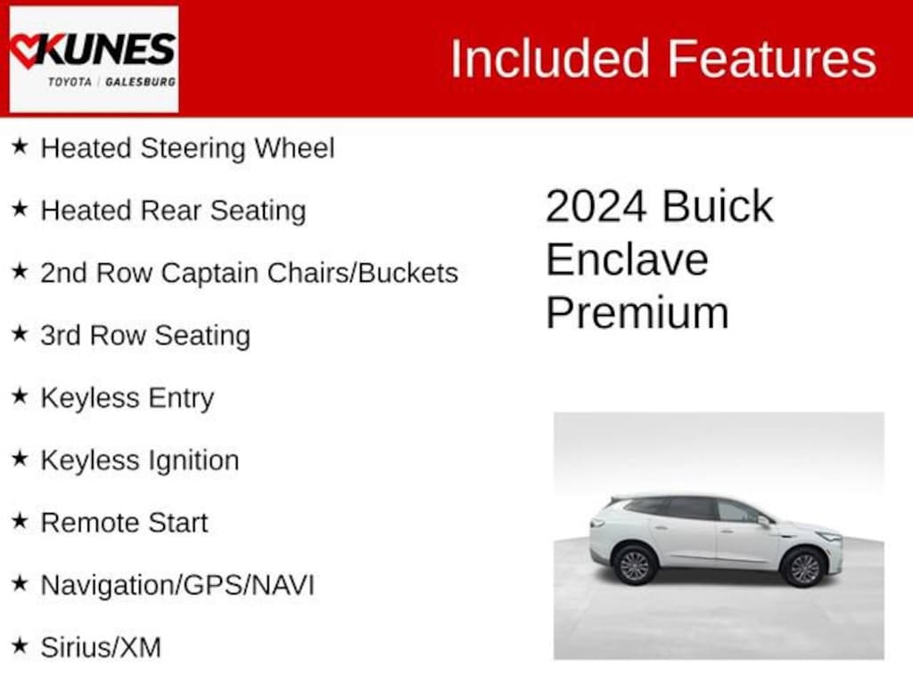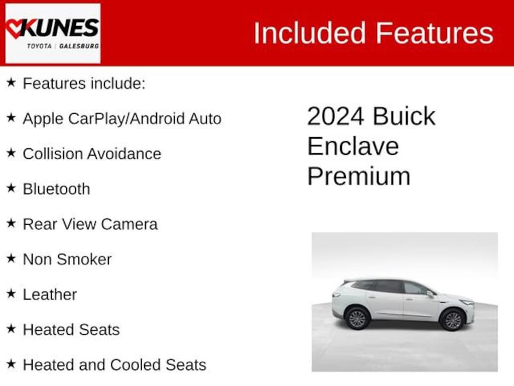 2024 Buick Enclave Premium Group Summit White CARFAX One-Owner. Clean CARFAX. Features include:, Apple CarPlay/Android Auto, Collision Avoidance, Bluetooth, Rear View Camera, Non Smoker, Leather, Heated Seats, Heated and Cooled Seats, Heated Steering Wheel, Heated Rear Seating, 2nd Row Captain Chairs/Buckets, 3rd Row Seating, Keyless Entry, Keyless Ignition, Remote Start, Navigation/GPS/NAVI, Sirius/XM, Satellite Radio, MP3 player, Power Lift Gate, Steering Wheel Controls, Advanced Safety Features, AMAZING ENCLAVE HERE BEING OFFERED , ONE ONWER , NO ACCIDENTS , THIS WONT LAST LONG , HURRY..., BIRDS EYE VIEW BACK UP CAMERA, HEADS UP DISPLAY,, ***BOSE AUDIO SOUND SYSTEM, MEMORY SEATS ***, CAME FROM WEST COAST ( NO SALT ), AWD.
