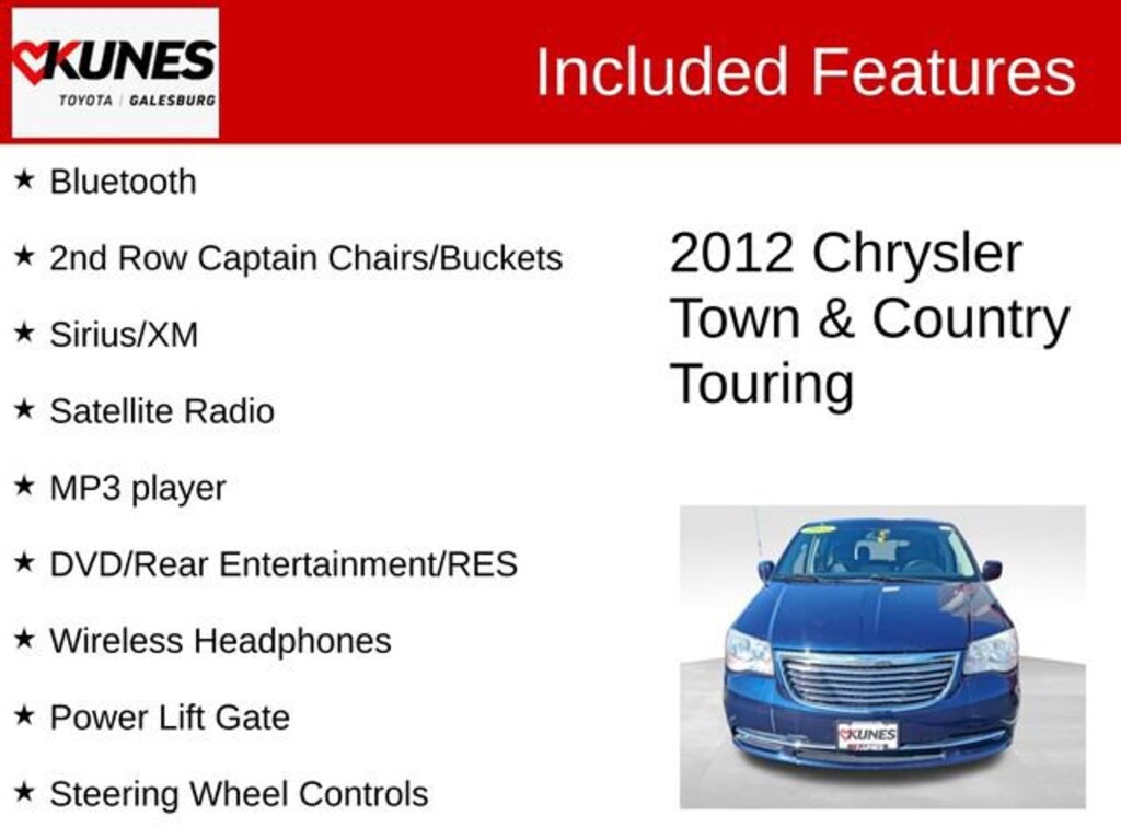 * If you refuse to accept lifeâs necessities like family transportation and versatile utility without a generous helping of luxury and style, the 2012 Chrysler Town & Countryâs impressive standard and available features will likely satisfy your needs as well as your desires. Source: KBB.com