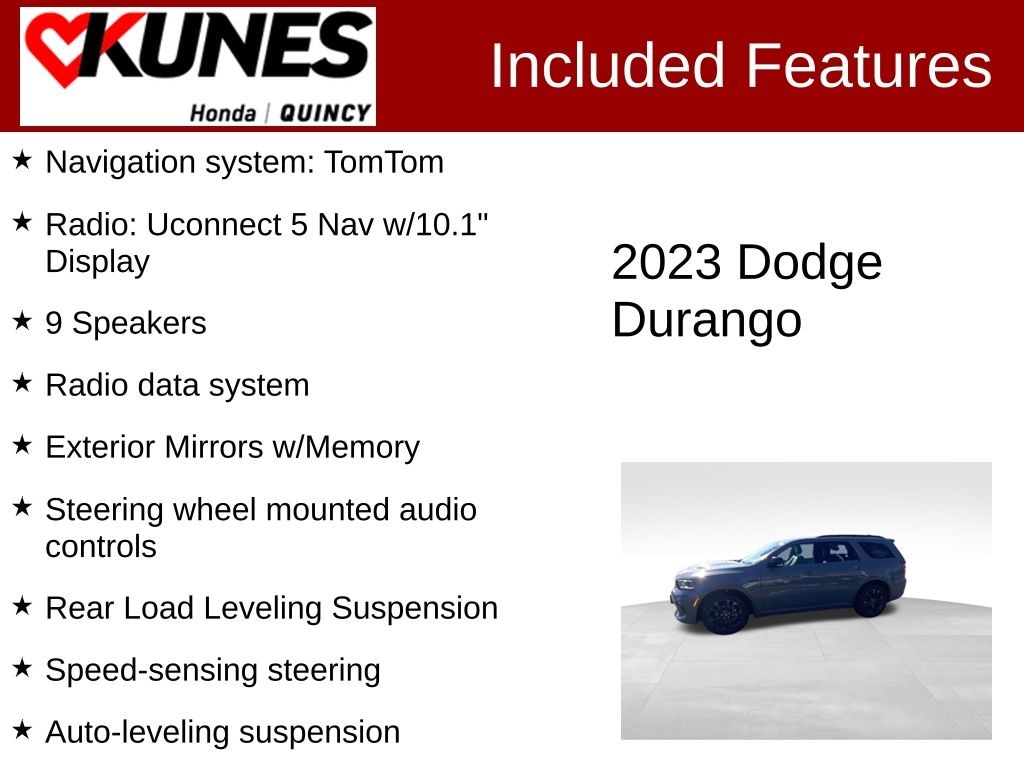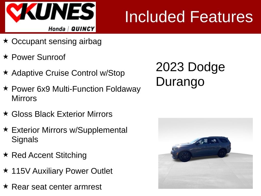 CARFAX One-Owner. Clean CARFAX. Destroyer Gray Clearcoat 2023 Dodge Durango R/T Plus AWD 8-Speed Automatic HEMI 5.7L V8 Multi Displacement VVT NAVIGATION, HEATED/COOLED SEATS, ADAPTIVE CRUISE, HEATED SEATS, PANORAMIC MOONROOF, MOON ROOF, REMOTE START, BACKUP CAMERA, SIRIUSXM RADIO, REAR PARK ASSIST, BLUETOOTH, SMARTPHONE APP ENABLED, APPLE CAR PLAY/ ANDROID AUTO, AWD, 115V Auxiliary Power Outlet, 7 & 4 Pin Wiring Harness, 9 Speakers, Adaptive Cruise Control w/Stop, Auto-leveling suspension, Black Roof Rails, Class IV Receiver Hitch, Exterior Mirrors w/Memory, Exterior Mirrors w/Supplemental Signals, Floor Console w/Leather Armrest, Front Center Armrest w/Storage, Front reading lights, Gloss Black Exterior Mirrors, Integrated Roof Rail Crossbars, Navigation system: TomTom, Occupant sensing airbag, Passenger door bin, Power 6x9 Multi-Function Foldaway Mirrors, Power 8-Way Driver Memory 8-Way Passenger Seats, Power Sunroof, Radio data system, Radio: Uconnect 5 Nav w/10.1" Display, Rain sensing wipers, Rear Load Leveling Suspension, Rear reading lights, Rear seat center armrest, Rear window wiper, Red Accent Stitching, Speed-sensing steering, Split folding rear seat, Sport steering wheel, Steering wheel mounted audio controls, Tachometer, Telescoping steering wheel, Trailer Brake Control, Variably intermittent wipers, Voltmeter, Wheels: 20" x 8.0" Black Noise Aluminum.