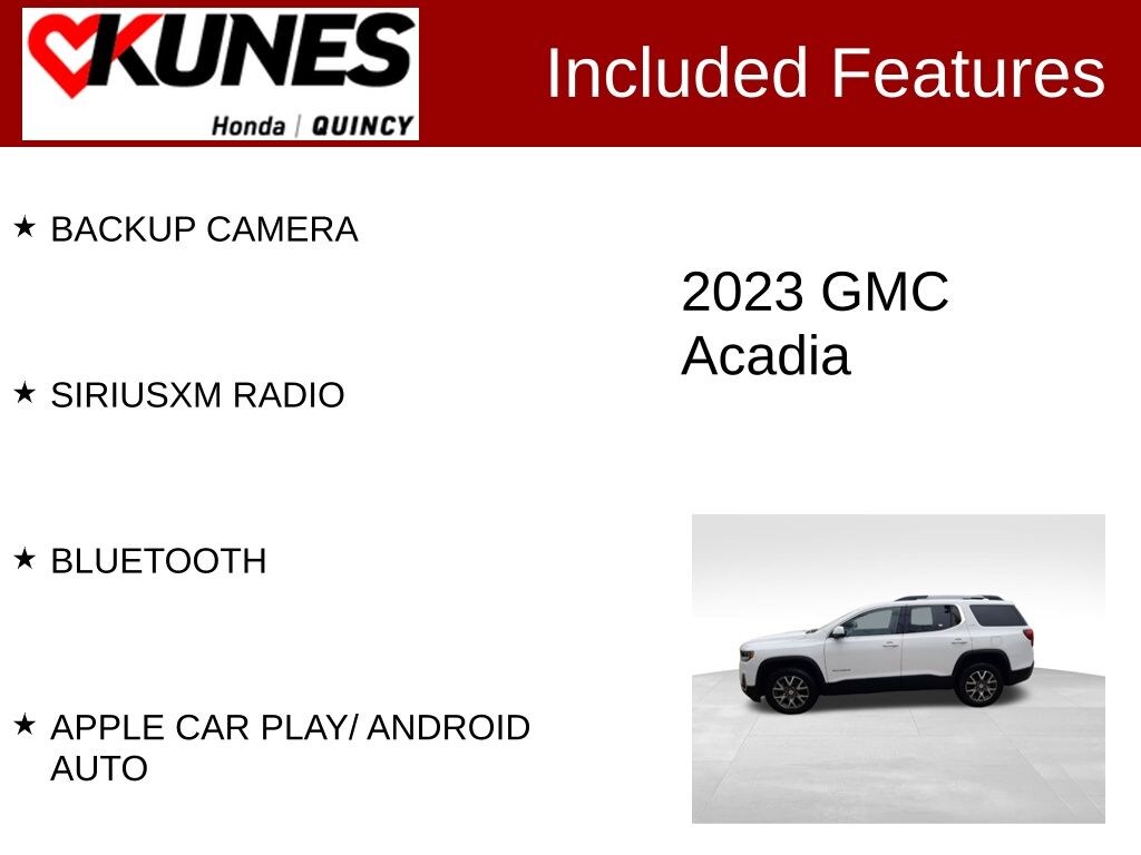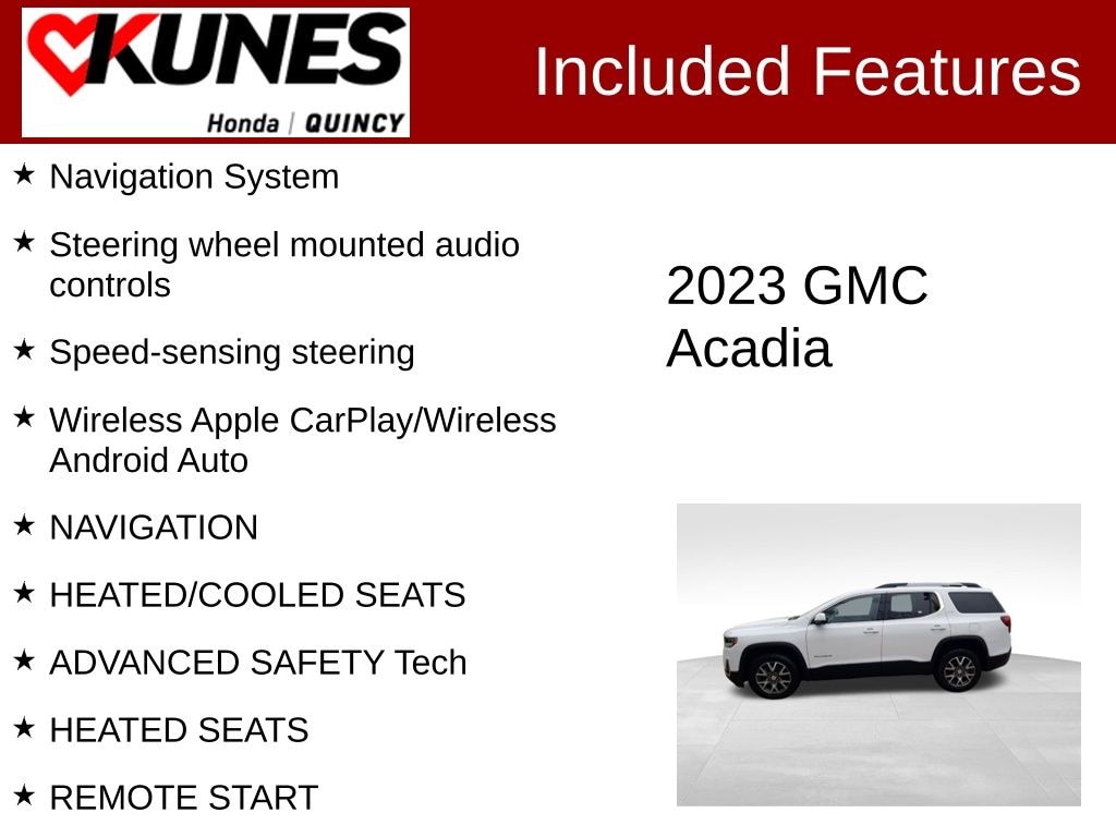 CARFAX One-Owner. Summit White 2023 GMC Acadia SLT AWD 9-Speed Automatic 2.0L Turbocharged NAVIGATION, HEATED/COOLED SEATS, ADVANCED SAFETY Tech, HEATED SEATS, REMOTE START, BACKUP CAMERA, SIRIUSXM RADIO, BLUETOOTH, APPLE CAR PLAY/ ANDROID AUTO, AWD, Black Leather, Navigation System, Speed-sensing steering, Steering wheel mounted audio controls, Wireless Apple CarPlay/Wireless Android Auto. 22/27 City/Highway MPG Odometer is 7649 miles below market average!