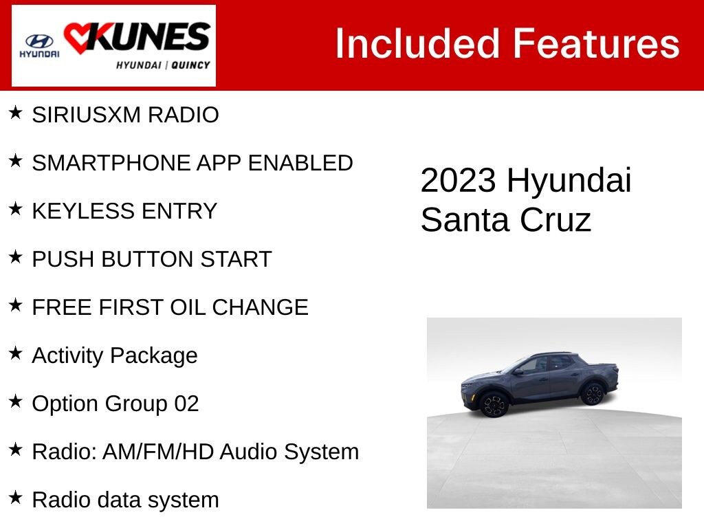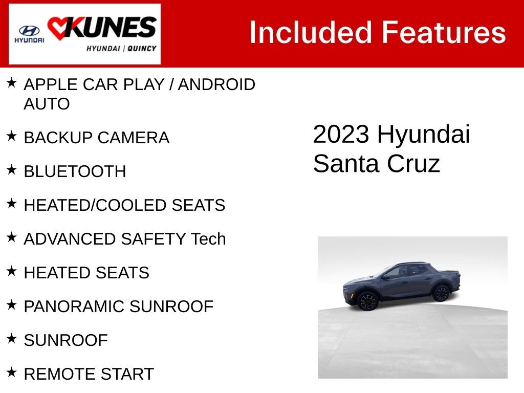APPLE CAR PLAY / ANDROID AUTO, BACKUP CAMERA, BLUETOOTH, HEATED/COOLED SEATS, ADVANCED SAFETY Tech, HEATED SEATS, PANORAMIC SUNROOF, SUNROOF, REMOTE START, SIRIUSXM RADIO, SMARTPHONE APP ENABLED, KEYLESS ENTRY, PUSH BUTTON START, FREE FIRST OIL CHANGE, 2 LED Bed Lighting, 6 Speakers, Activity Package, AM/FM radio: SiriusXM, Auto-leveling suspension, Conventional Power Sunroof, Delay-off headlights, Emergency communication system: Blue Link Connected Car Service (3-year complimentary subscription), Front Bucket Seats, Front Center Armrest, Front reading lights, Heated front seats, Integrated Tonneau Cover, Occupant sensing airbag, Option Group 02, Outside temperature display, Overhead console, Panic alarm, Radio data system, Radio: AM/FM/HD Audio System, Speed control, Speed-sensing steering, Split folding rear seat, Spoiler, Tachometer. Clean CARFAX. Hampton Gray 2023 Hyundai Santa Cruz SEL AWD 8-Speed Automatic with SHIFTRONIC 2.5L I4