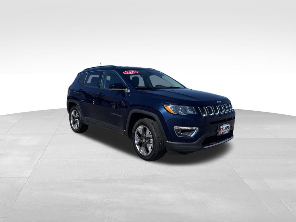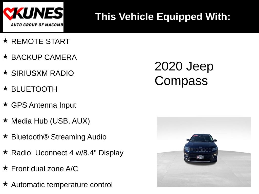 2020 Jeep Compass Limited REMOTE START, BACKUP CAMERA, SIRIUSXM RADIO, BLUETOOTH, 4WD, 2nd Row USB Type A, 8.4" Touch Screen Display, Anti-whiplash front head restraints, Automatic temperature control, Bluetooth® Streaming Audio, Bumpers: body-color, Compass, Driver door bin, Driver vanity mirror, Front anti-roll bar, Front dual zone A/C, Front reading lights, GPS Antenna Input, Illuminated entry, Leather Shift Knob, Leather Trimmed Bucket Seats, Leather Wrapped Shift Knob, Media Hub (USB, AUX), Occupant sensing airbag, Outside temperature display, Overhead airbag, Overhead console, Panic alarm, Passenger door bin, Passenger vanity mirror, Power door mirrors, Radio: Uconnect 4 w/8.4" Display, Rear anti-roll bar, Rear seat center armrest, Rear window wiper, Tachometer, Telescoping steering wheel, Tilt steering wheel, USB Host Flip, Variably intermittent wipers, Wheels: 18" x 7.0" Polished/Gray Pockets Aluminum. Jazz Blue Pearlcoat