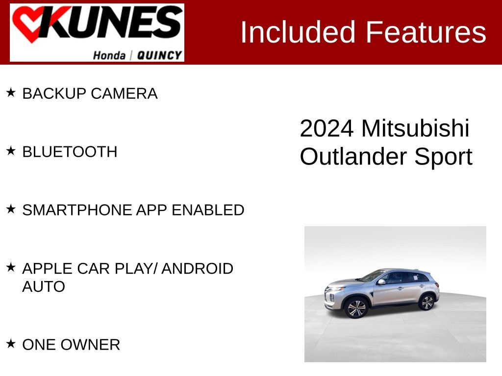CARFAX One-Owner. Clean CARFAX. Silver 2024 Mitsubishi Outlander Sport 4WD CVT 2.0L I4 DOHC 16V LEV3-ULEV70 148hp BACKUP CAMERA, BLUETOOTH, SMARTPHONE APP ENABLED, APPLE CAR PLAY/ ANDROID AUTO, ONE OWNER, 4WD. 23/29 City/Highway MPG