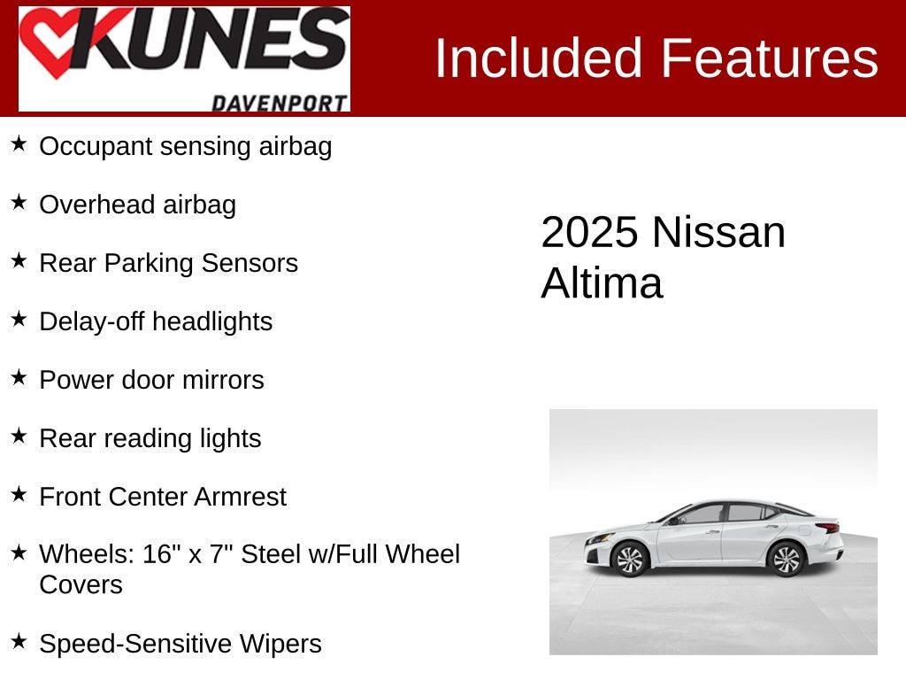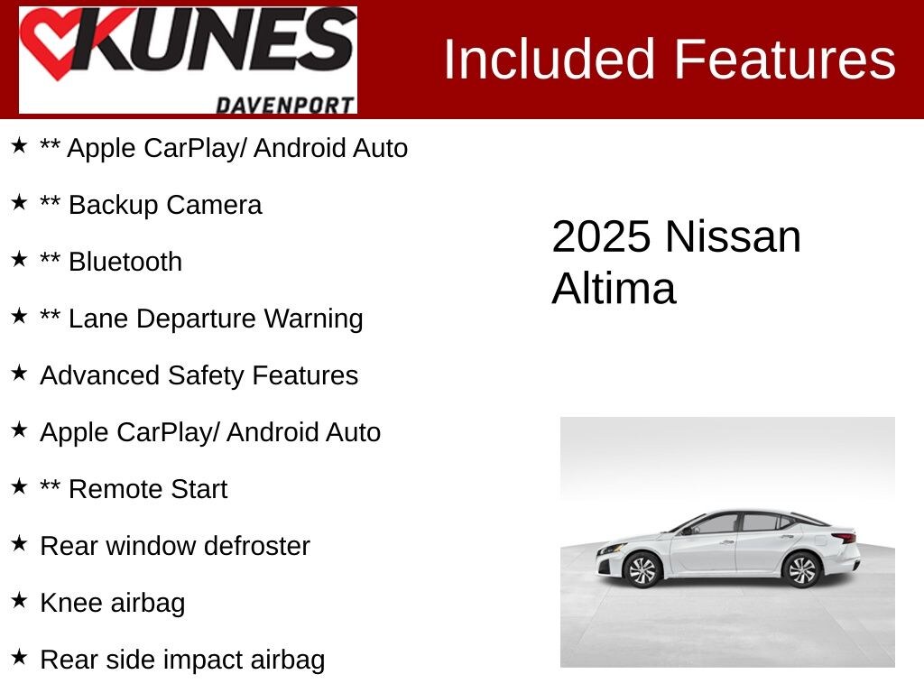 ** Apple CarPlay/ Android Auto, ** Backup Camera, ** Bluetooth, ** Lane Departure Warning, Advanced Safety Features, Apple CarPlay/ Android Auto, ** Remote Start, CVT with Xtronic, Delay-off headlights, Front Center Armrest, Knee airbag, Occupant sensing airbag, Overhead airbag, Power door mirrors, Rear Parking Sensors, Rear reading lights, Rear side impact airbag, Rear window defroster, Speed-Sensitive Wipers, Wheels: 16" x 7" Steel w/Full Wheel Covers.