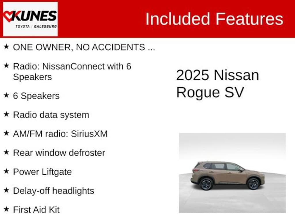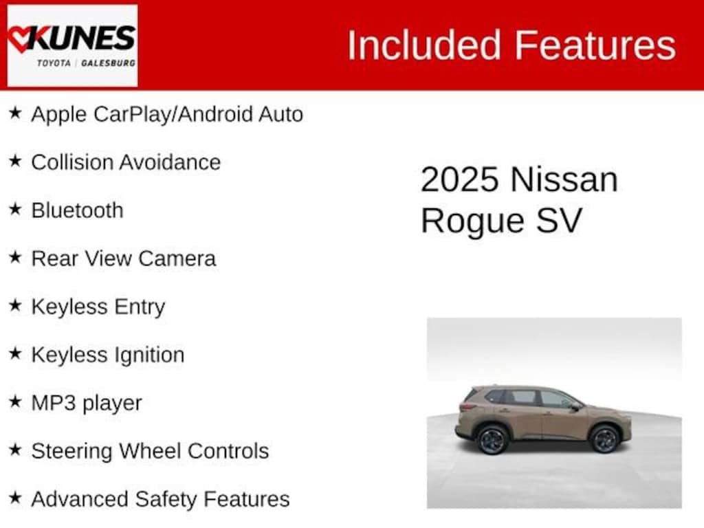 2025 Nissan Rogue SV Baja Storm Metallic CARFAX One-Owner. Apple CarPlay/Android Auto, Collision Avoidance, Bluetooth, Rear View Camera, Keyless Entry, Keyless Ignition, MP3 player, Steering Wheel Controls, Advanced Safety Features, ONE OWNER, NO ACCIDENTS ..., 6 Speakers, AM/FM radio: SiriusXM, Delay-off headlights, First Aid Kit, Floor Mats with 1-Piece Cargo Area Protector, Front Bucket Seats with 8-Way Power Driver Seat, Heated door mirrors, Panic alarm, Power Liftgate, Radio data system, Radio: NissanConnect with 6 Speakers, Rear seat center armrest, Rear window defroster, Speed control, Split folding rear seat, Spoiler, Variably intermittent wipers.