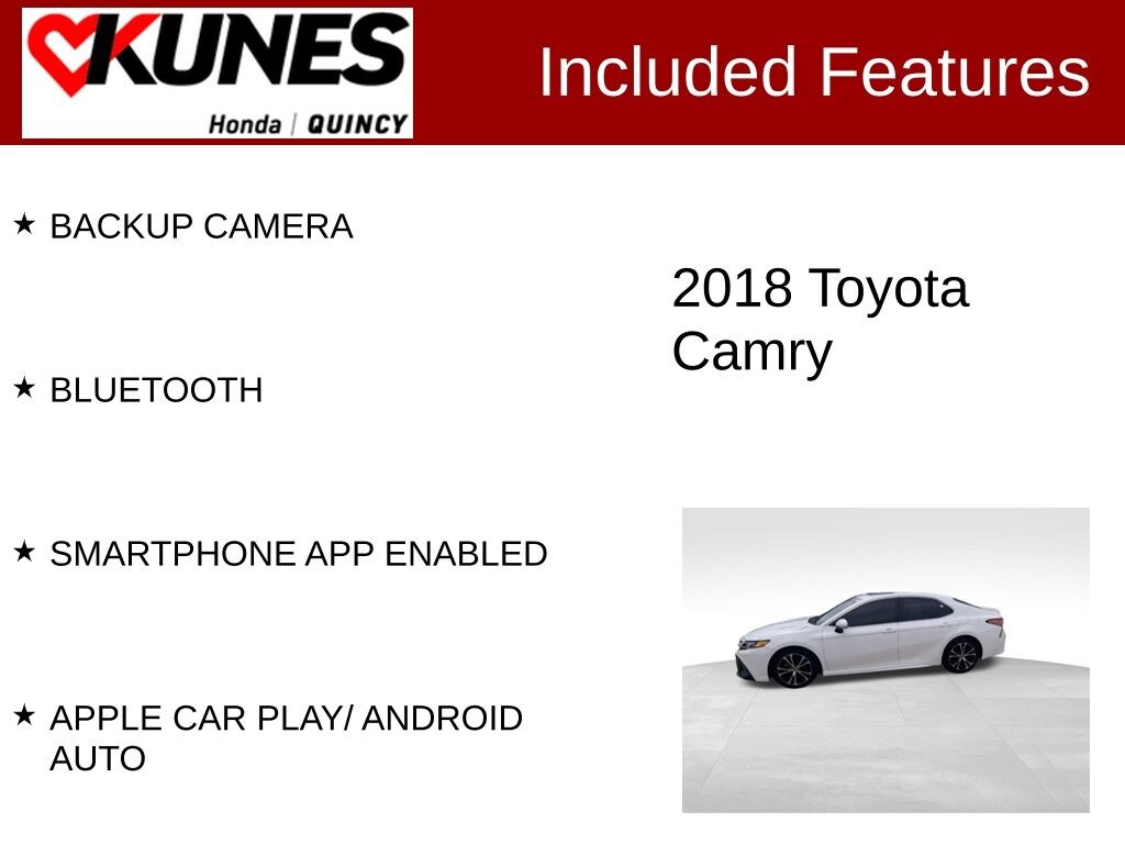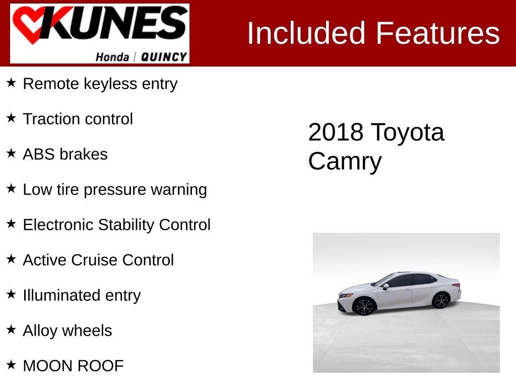 White 2018 Toyota Camry SE FWD 8-Speed Automatic 2.5L I4 DOHC 16V MOON ROOF, BACKUP CAMERA, BLUETOOTH, SMARTPHONE APP ENABLED, APPLE CAR PLAY/ ANDROID AUTO, Cloth, ABS brakes, Active Cruise Control, Alloy wheels, Electronic Stability Control, Illuminated entry, Low tire pressure warning, Remote keyless entry, Traction control. 29/41 City/Highway MPG