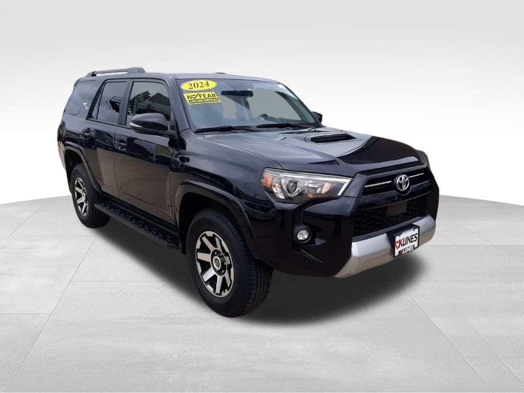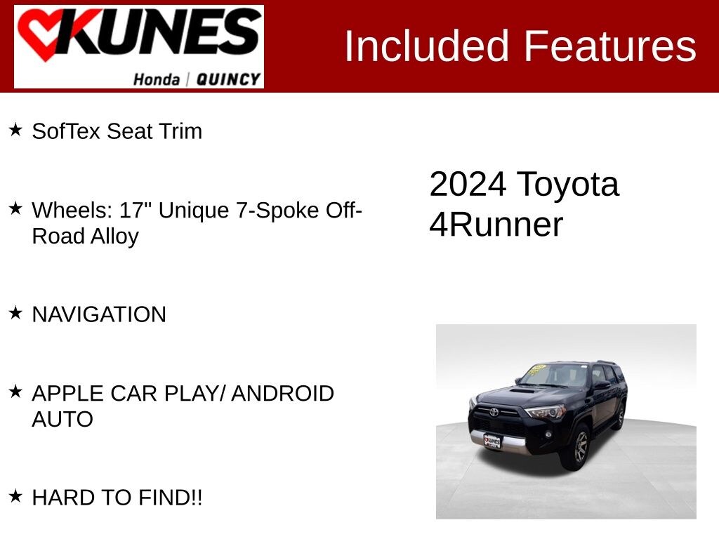CARFAX One-Owner. Clean CARFAX. Black 2024 Toyota 4Runner TRD Off-Road Premium 4WD 5-Speed with ECT 4.0L V6 DOHC 24V NAVIGATION, APPLE CAR PLAY/ ANDROID AUTO, HARD TO FIND!!, 4WD, Black/Graphite w/Leather Seat Trim, Apple CarPlay/Android Auto, Electronic Stability Control, Exterior Parking Camera Rear, Heated Outside Rear-View Mirrors, Heated steering wheel, Illuminated entry, Power driver seat, Remote keyless entry, SofTex Seat Trim, Steering wheel mounted audio controls, Wheels: 17" Unique 7-Spoke Off-Road Alloy.