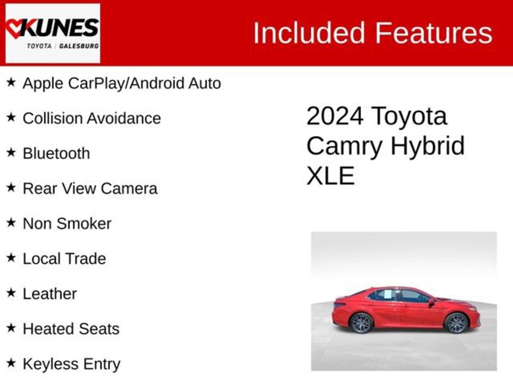 2024 Toyota Camry Hybrid XLE Red Recent Arrival! CARFAX One-Owner. Clean CARFAX. Apple CarPlay/Android Auto, Collision Avoidance, Bluetooth, Rear View Camera, Non Smoker, Local Trade, Leather, Heated Seats, Keyless Entry, Keyless Ignition, Navigation/GPS/NAVI, Sirius/XM, Satellite Radio, Sunroof/Moonroof, Steering Wheel Controls, Advanced Safety Features, ONE OWNER, LOCAL TRADE IN , NO ACCIDENTS !, 2.5L I4 DOHC 16V.