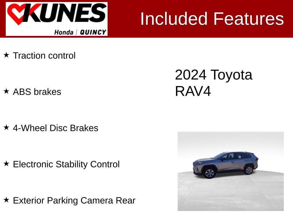 CARFAX One-Owner. Clean CARFAX. Silver 2024 Toyota RAV4 LE AWD 8-Speed Automatic 2.5L 4-Cylinder DOHC Dual VVT-i AWD, Ash Cloth, 4-Wheel Disc Brakes, ABS brakes, Electronic Stability Control, Exterior Parking Camera Rear, Traction control. 27/34 City/Highway MPG Odometer is 1911 miles below market average!