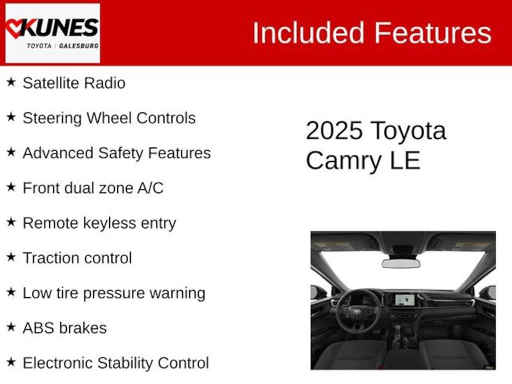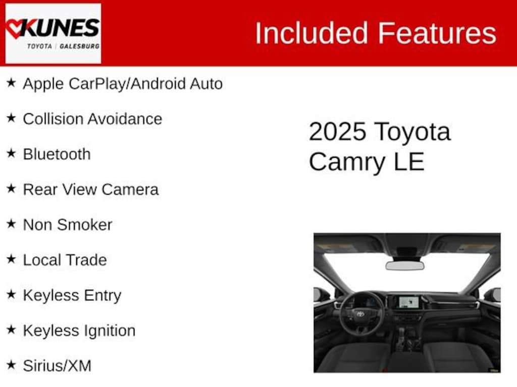 2025 Toyota Camry LE Underground Recent Arrival! CARFAX One-Owner. Apple CarPlay/Android Auto, Collision Avoidance, Bluetooth, Rear View Camera, Non Smoker, Local Trade, Keyless Entry, Keyless Ignition, Sirius/XM, Satellite Radio, Steering Wheel Controls, Advanced Safety Features, 2.5L 4-Cylinder 16V DOHC, Black w/Fabric Seat Trim, ABS brakes, Active Cruise Control, Alloy wheels, Electronic Stability Control, Front dual zone A/C, Heated door mirrors, Illuminated entry, Low tire pressure warning, Remote keyless entry, Traction control.