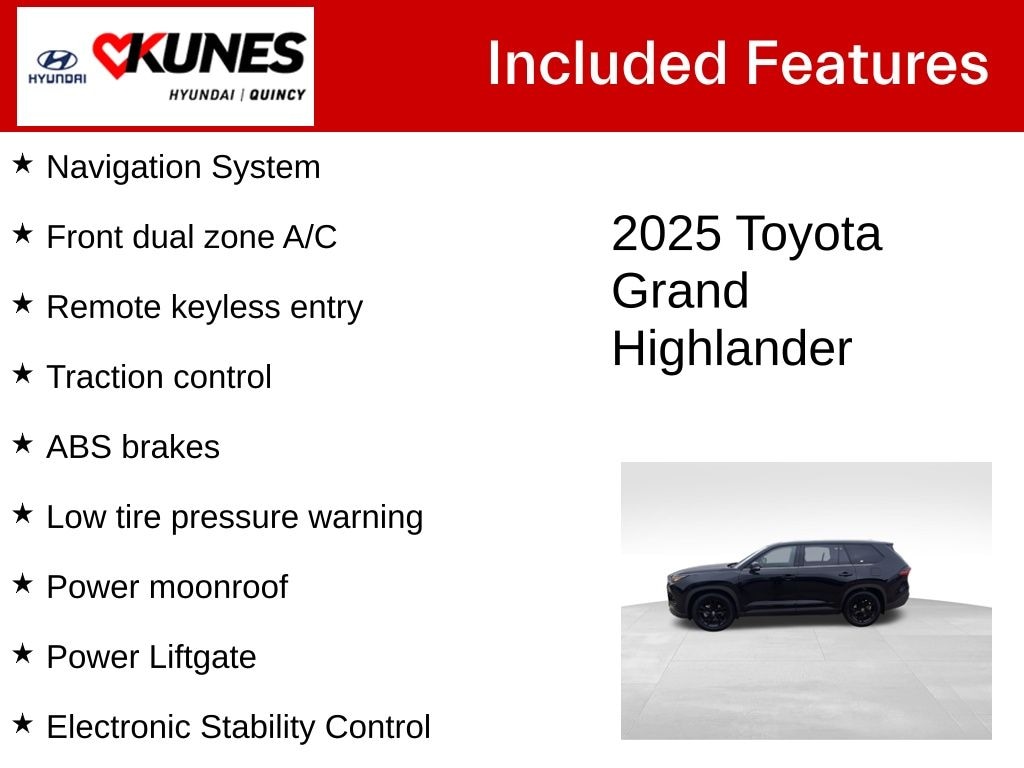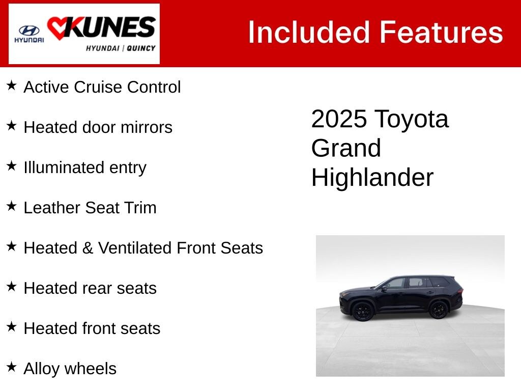 Certified. ABS brakes, Active Cruise Control, Alloy wheels, Electronic Stability Control, Front dual zone A/C, Heated & Ventilated Front Seats, Heated door mirrors, Heated front seats, Heated rear seats, Illuminated entry, Leather Seat Trim, Low tire pressure warning, Navigation System, Power Liftgate, Power moonroof, Remote keyless entry, Traction control. CARFAX One-Owner. Midnight Black Metallic 2025 Toyota Grand Highlander Platinum AWD 8-Speed Automatic 2.4L 4-Cylinder