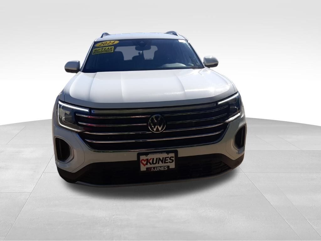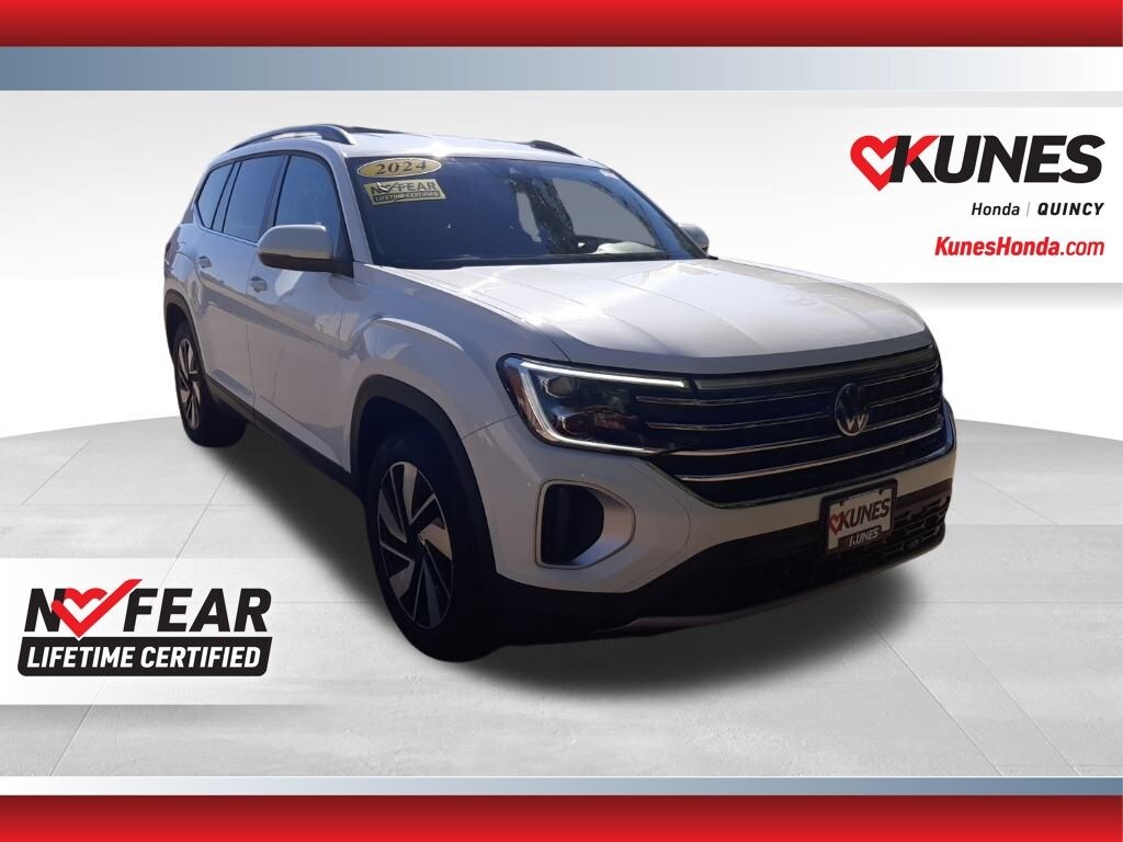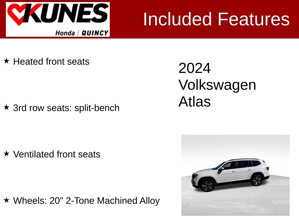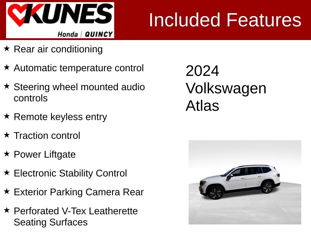CARFAX One-Owner. Clean CARFAX. White 2024 Volkswagen Atlas 2.0T SE w/Technology AWD 8-Speed Automatic with Tiptronic 2.0L TSI 3rd row seats: split-bench, Automatic temperature control, Electronic Stability Control, Exterior Parking Camera Rear, Heated front seats, Perforated V-Tex Leatherette Seating Surfaces, Power Liftgate, Rear air conditioning, Remote keyless entry, Steering wheel mounted audio controls, Traction control, Ventilated front seats, Wheels: 20" 2-Tone Machined Alloy. 19/26 City/Highway MPG Odometer is 2034 miles below market average!